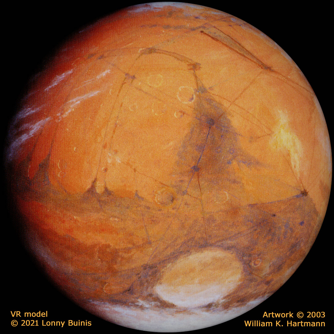 Virtual-Reality Mars if Percival Lowell had been right. Model © 2021 Lonny Buinis, painting by William Hartmann. Open in any Web browser that supports HTML5 and CSS. Rotate in any direction with fingers or pointing device. Zoom by pinching, scrolling, or use the buttons.