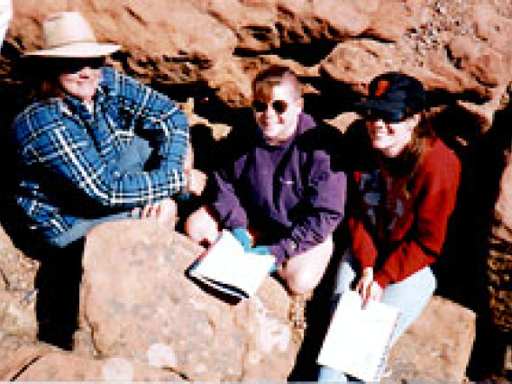 Cynthia, Barb, and Zibi try to keep warm in a rock crevice while learning about the mechanics of Plateau uplift.