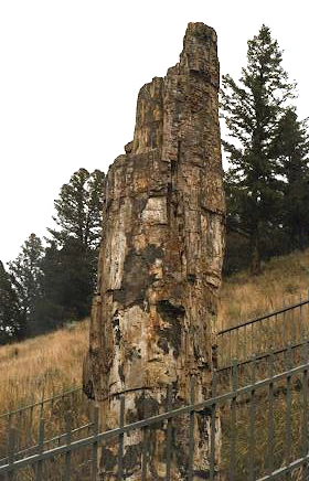 During the Yellowstone area volcanism, trees were buried in deep layers of pyroclastic ashflow. The trees were preserved upright in the rock in their original orientations. Here, a tree that has remained as the surrounding tuff weathered away.
