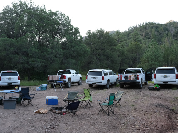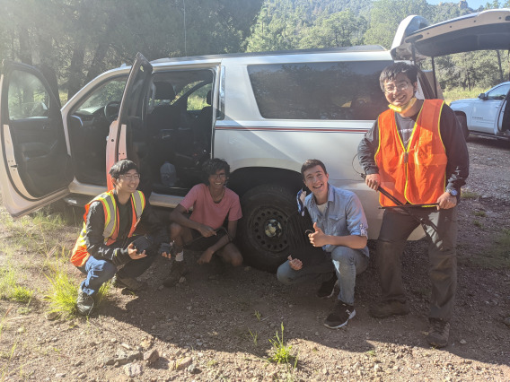 The group of ~17 people poses in their vests with the camera propped on a rock. Image by Robert Melikyan