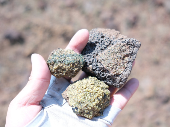 A student holds basalt rocks and xenolithic crystals found on hikes. One rock has a bubbly black texture and another is covered in small, bright green crystals. Image by Harry Tang