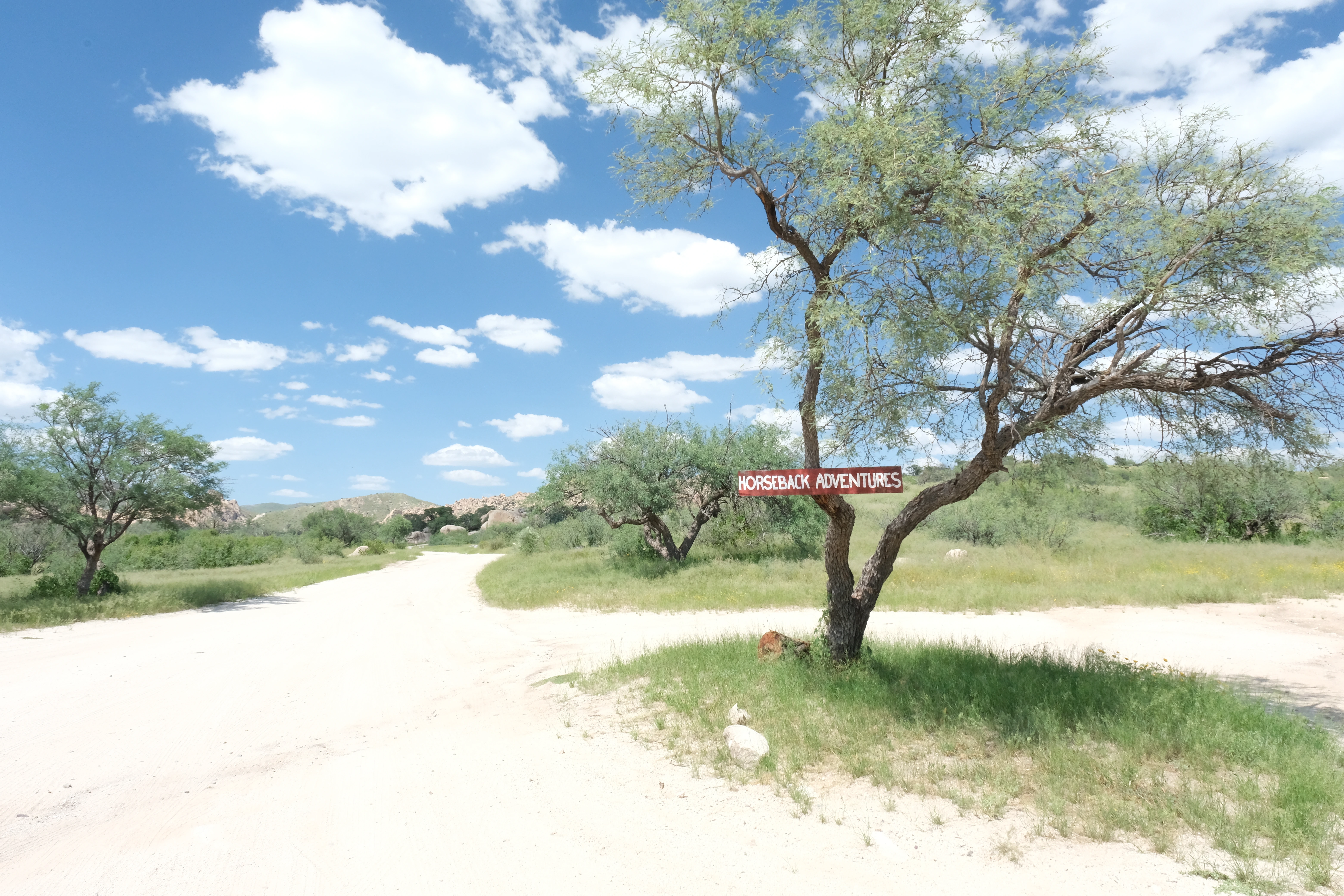 A idyllic scene with fluffy clouds dotting a blue sky. A sign reads "Horseback Adventures". Image by Harry Tang