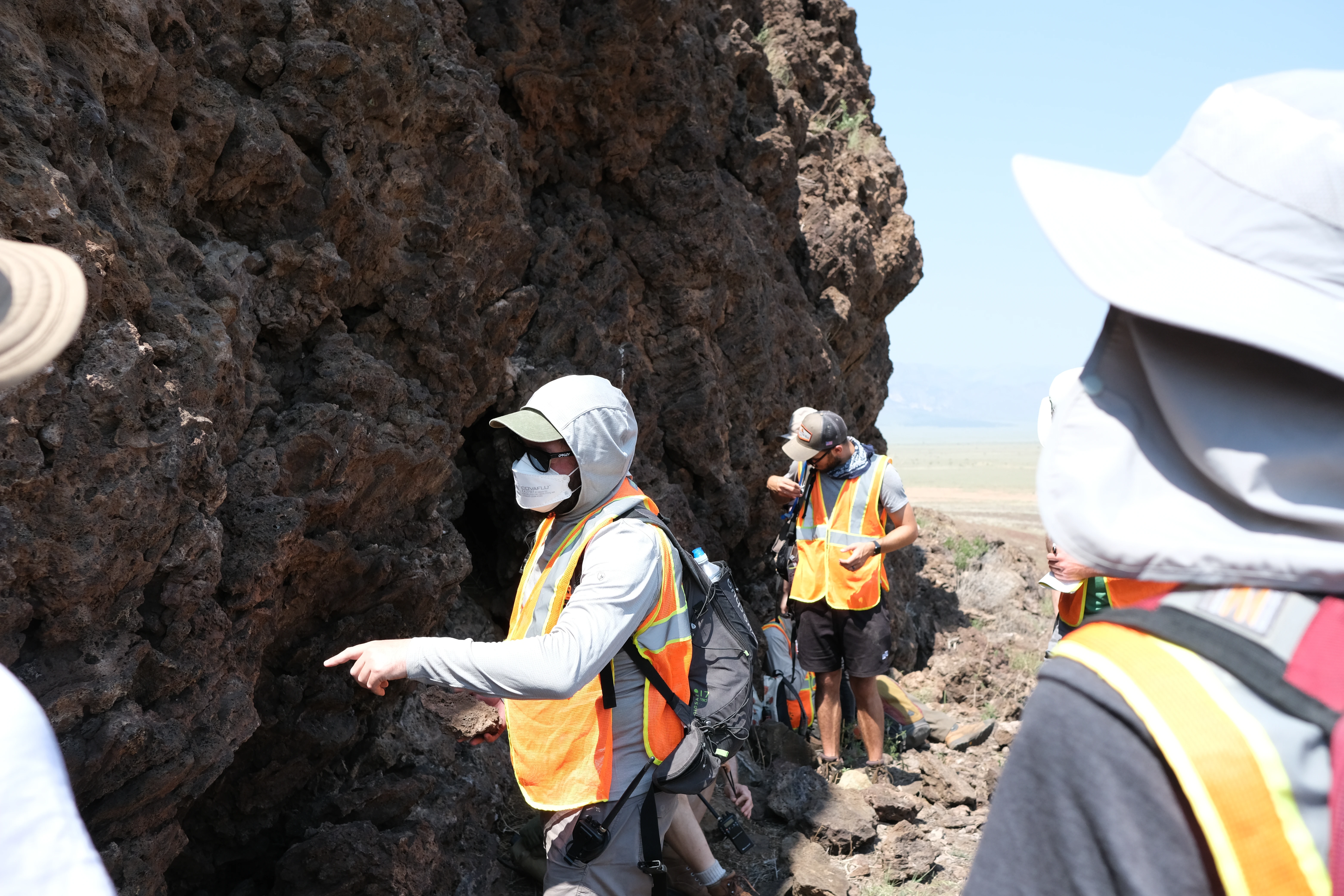 Students in safety vests, hats, and masks look at rock features in a cliff side on a sunny day. Image by Harry Tang