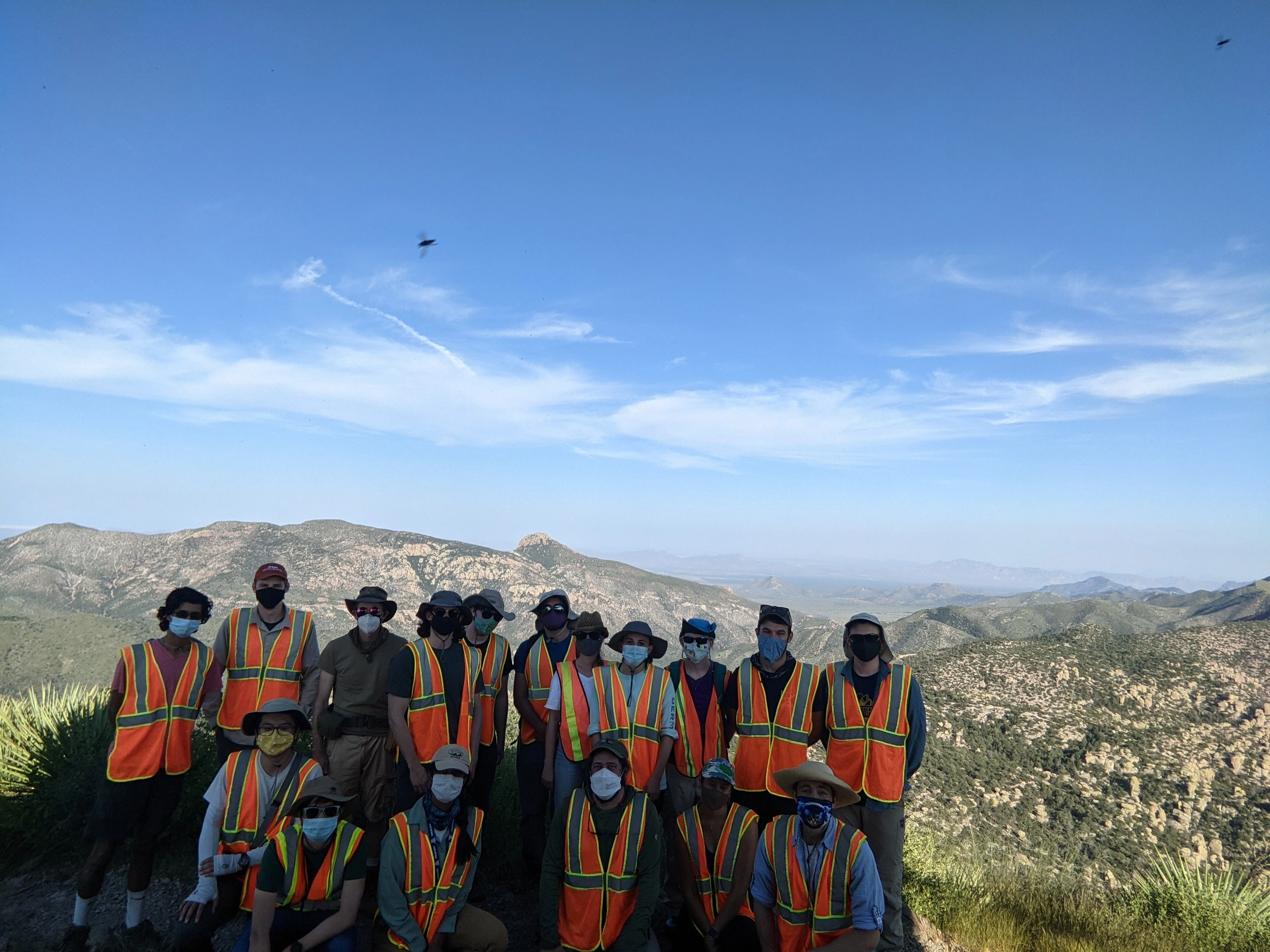 The group of 17 people poses for a picture in their vests in front of a valley with mountains in the back. Some small bugs fly in front of the camera. Image by Robert Melikyan