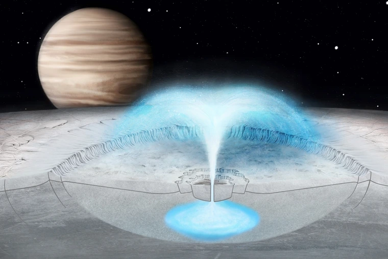 Image Plumes on Icy Worlds Hold Clues About What Lies Beneath Dec. 16, 2020 A new model shows how brine on Jupiter’s moon Europa can migrate within the icy shell to form pockets of salty water that erupt to the surface when freezing. The findings are important for the upcoming Europa Clipper mission and may explain cryovolcanic eruptions across icy bodies in the solar system. Read more