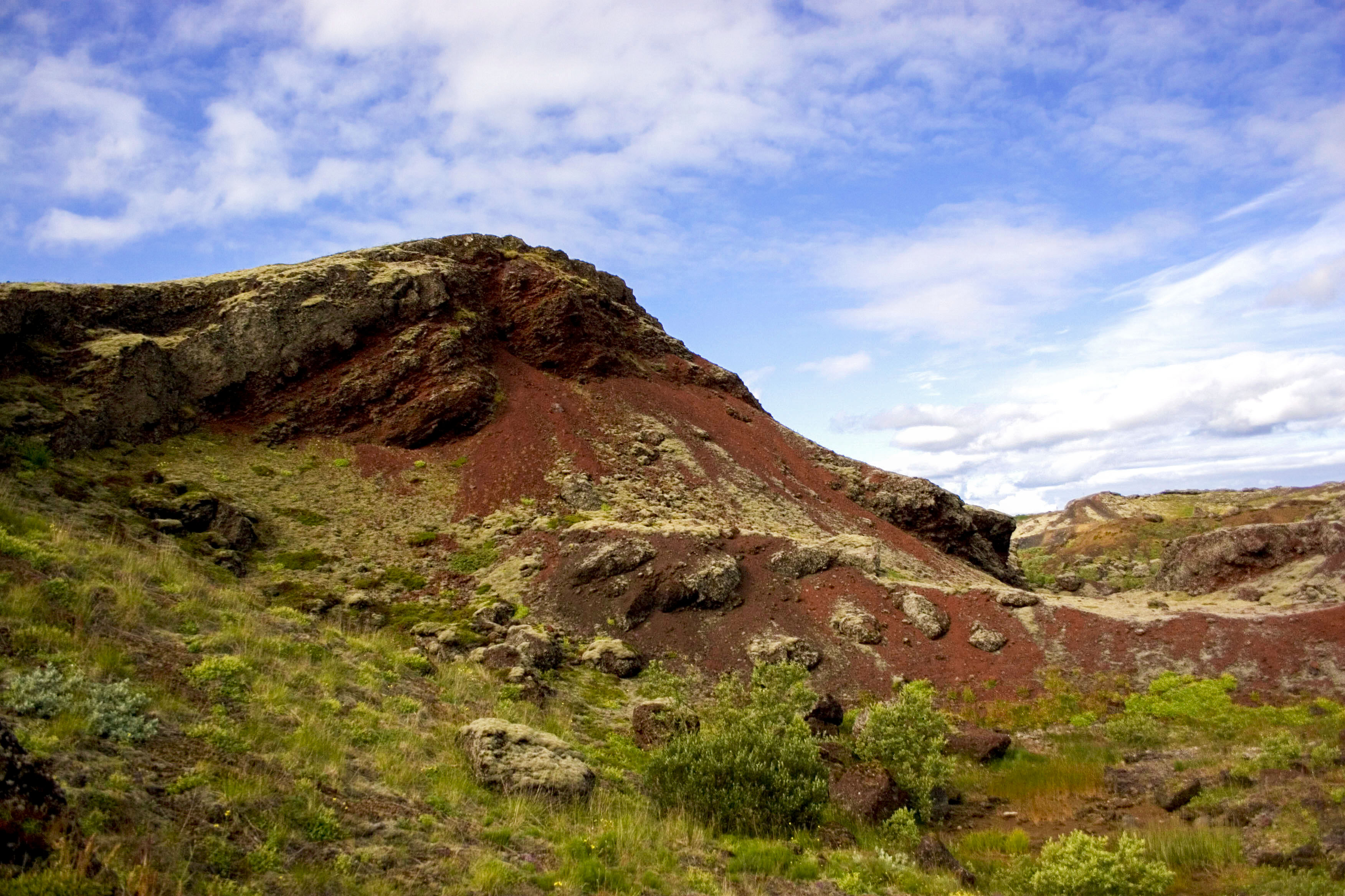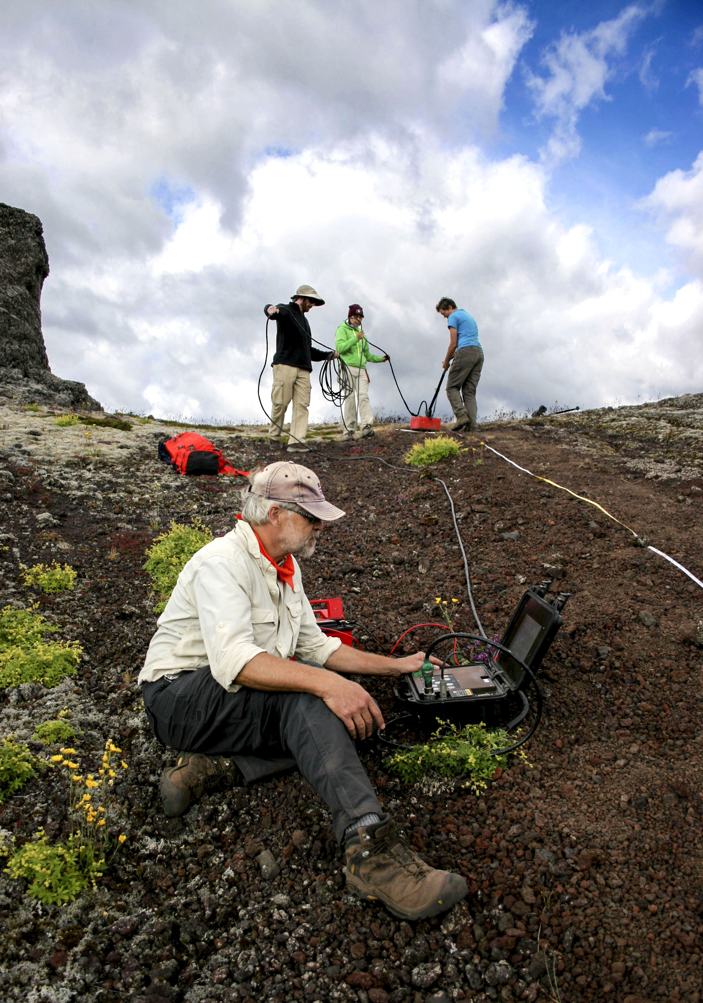 The Rauðhólar rootless cone group is located within the ~5200 year old Elliðaá lava flow (Elliðaáhraun in Icelandic) in the Western Volcanic Zone of Iceland. Rauðhólar is situated where Elliðaáhraun entered a shallow paleo-lake basin to form a ~2-km-wide flow that includes over 140 rootless eruption sites. The tephra deposits associated with the were partially quarried in the early- to mid-twentieth century, which provides extrodinary windows into the internal stratigraphy of the these volcanic rootless cones. Our team examined the layering structure within these quarry exposures and tested a variety of remote sensing techniques to better understand the formation of the deposits. These methods included ground penetrating radar, kite-based imaging, Unmanned Aerial Vehicles (UAV) surveys.