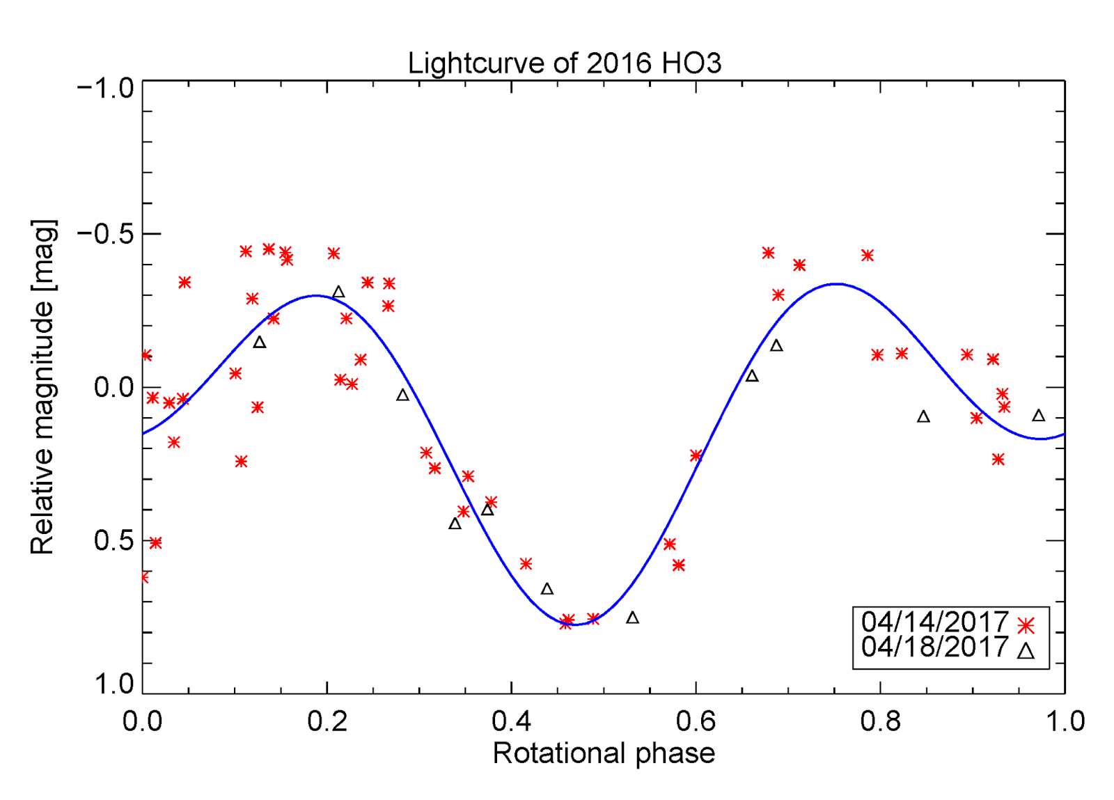 "In an effort to constrain its rotation period and surface composition, we observed 2016 HO3 on April 14 and 18 with the Large Binocular Telescope and the Discovery Channel Telescope," Reddy said. "The derived rotation period and the spectrum of emitted light are not uncommon amongst small NEOs, suggesting that 2016 HO3 is a natural object of similar provenance to other small NEOs."